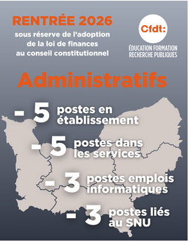 Les personnels administratifs ne sont pas épargnés par ces coupes à tout va, puisque 5 suppressions de postes dans les établissements sont annoncées, et que les services académiques devront rendre 11 postes en tout (il est déjà loin le temps où le ministère s’engageait à avoir une attention particulière pour notre académie fusionnée, forcée de travailler sur deux sites rectoraux).